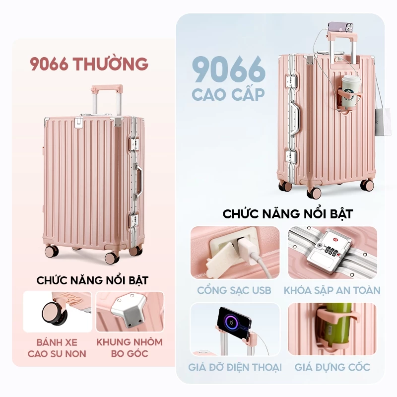 Vali 9066A có khung viền nhôm nguyên khối cứng cáp đồng thời có thiết kế bo góc bằng kim loại giúp bảo vệ vali khỏi những va đập mạnh. Phần khung nhôm mang đến cảm giác sang trọng, hiện đại, phù hợp với xu hướng thiết kế vali hiện nay.
